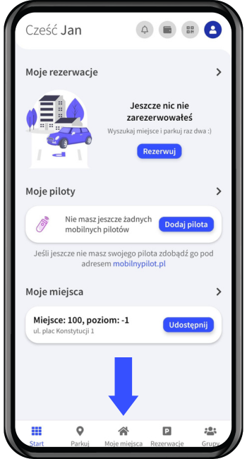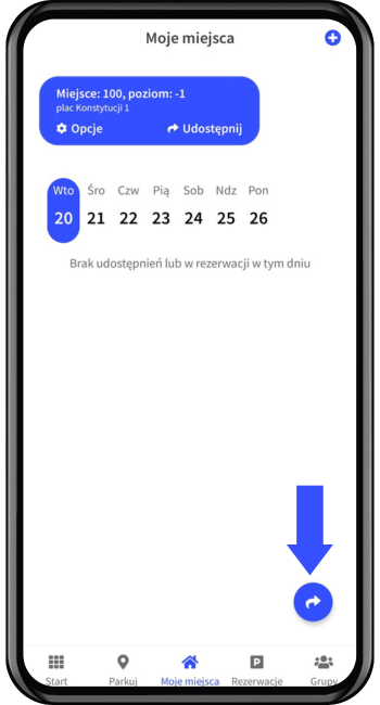 1. Z ekranu głónego wybierz zakładkę "Moje miejsca", następnie kliknij "Udostępnij" lub ikonę w prawym dolnym rogu.