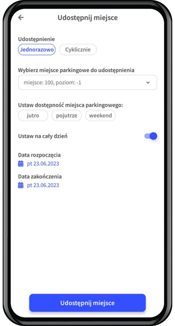 2. Określ zasady udostępnienia: możesz udostępnić miejsce jednorazowo (np. jeden dzień) lub cyklicznie (np. każdy piątek), następnie uzupełnij dzień i godzinę, kiedy Twoje miejsce ma zostać udostępnione innej osobie. Zatwierdź wybór klikając" Udostępnij miejsce".