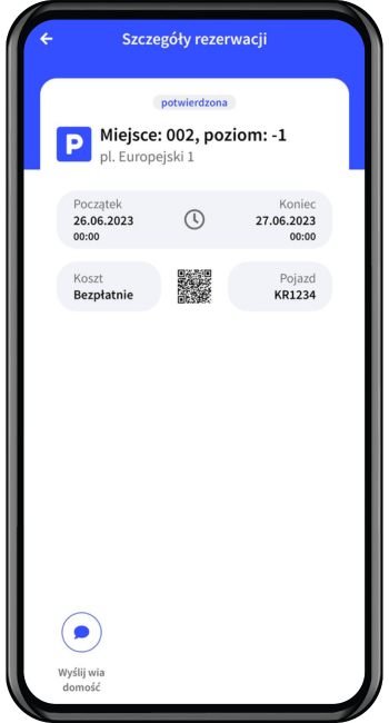 5. Po zarezerwowaniu miejsca otrzymasz szczegóły rezerwacji. Zarezerwowane miejsce pojawi się również na ekranie głównym aplikacji. Przyciski do otwarcia wjazdu/wyjazdu pojawią się w dniu rezerwacji.