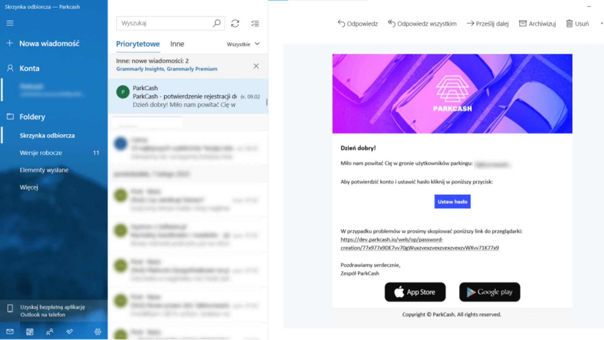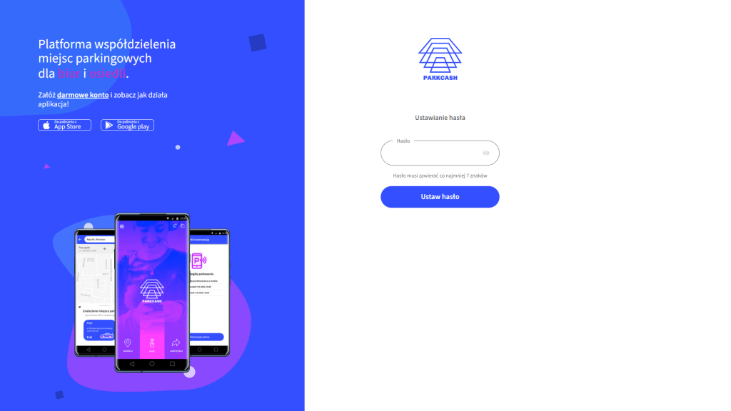 1. Otrzymałeś wiadomość na skrzynkę pocztową z zaproszeniem do korzystania z rezerwacji miejsc parkingowych. Postępuj zgodnie z poleceniami - ustaw hasło do logowania w aplikacji ParkCash.
