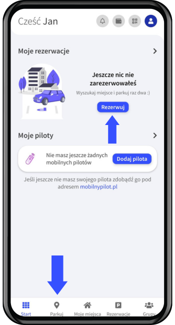 1. Na ekranie głównym wybierz "Parkuj" lub "Rezerwuj". Następnie wybierz parking z którego będziesz korzystał.