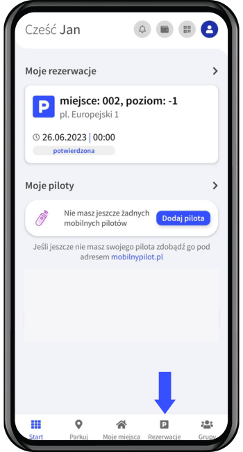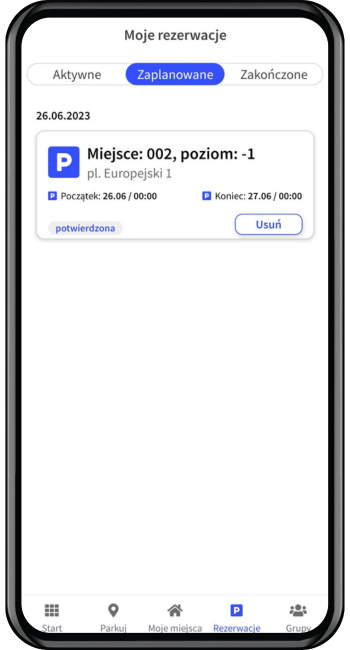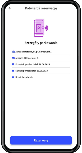 5. Po zarezerwowaniu miejsca otrzymasz szczegóły rezerwacji. Zarezerwowane miejsce pojawi się również na ekranie głównym aplikacji. Przyciski do otwarcia wjazdu/wyjazdu pojawią się w dniu rezerwacji.