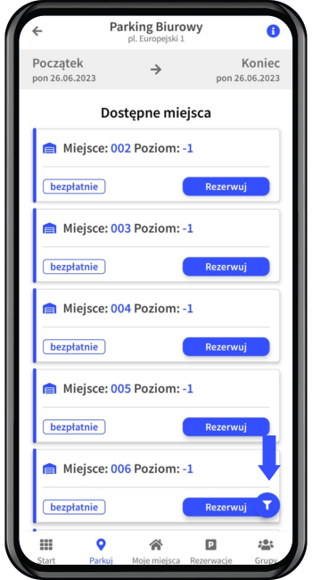 3. Klikając w ikonę zaznaczoną na czerwono możesz przefiltrować miejsca parkingowe po poziomach i sektorach. Następnie potwierdź szczegóły parkowania.